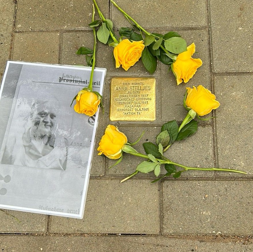 Ende 1936 ziehen die Eheleute Stelljes nach Hambergen. Als es auch hier zu angeblichen Erregungszuständen kommt, wird Anna am 13.05.1937 mit 68 Jahren das erste Mal in die Heilanstalt Lüneburg als nun zuständiges Krankenhaus eingewiesen. Hier verbleibt sie bis zum Jahr 1941 als die psychischen Kliniken im Rahmen der Aktion T4 aufgefordert waren, vermeintlich unheilbare Kranke zu benennen, die den Tötungsanstalten zugeführt werden sollen. Auf einer dieser Listen landet Anna Stelljes und sie wird am 30.04.1941 in die Zwischenanstalt Herborn verlegt. Von dort kommt sie am 16.06.1941 nach Hadamar und wird dort am selben Tag ermordet. In Hadamar wurden in den Jahren 1941-45 fast 15.000 Menschen ermordet, davon 10.000 alleine im Rahmen der Aktion T4 von Januar bis August 1941. Ende 1940 wurde das Gebäude der Landesheilanstalt Hadamar in eine Tötungsanstalt umgebaut. Auftraggeber war die Organisation der zentralgesteuerten „Erwachseneneuthanasie“, die später als „Aktion T4“ bezeichnet wurde. In der Berliner Tiergartenstraße 4 hatte die Organisation ihren Hauptsitz. Der Auftrag zur Durchführung der Morde kam von Adolf Hitler selbst. In Hadamar wurden im Rahmen des Umbaus eine Gaskammer und Krematoriumsöfen errichtet. Die Patienten kamen aus den Zwischenstationen mit Bussen nach Hadamar, mussten sich in einem großen Saal ausziehen, ihre Personalien wurden von Verwaltungspersonal abgeglichen und sie wurden mit Kohlemonoxid in der Gaskammer ermordet. Im Anschluss erfolgte die sofortige Kremierung. Die Angehörigen erhielten sogenannte Trostbriefe, in denen falsche Todesursachen aufgeführt wurden.