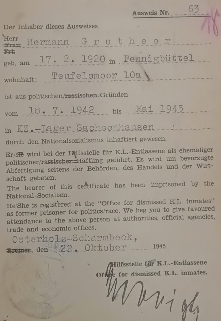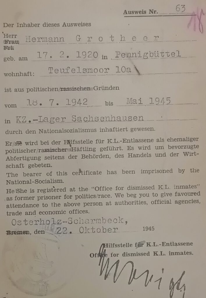 Hermann Grotheer, Jg. 1920, lebte in Pennigbüttel. Im September 1940 wurde er in eine Luftwaffeneinheit ins Ausbildungsregiment 42/Salzwedel eingezogen. Im Anschluss an seine militärische Ausbildung war er Angehöriger des 2. Fallschirmregiments in Tangermünder. Die Einheit war zeitweise in Berlin in der Hermann Göring-Kaserne stationiert. In seinem Antrag, als Verfolgter des NS-Regimes anerkannt zu werden, schreibt Hermann Grotheer, dass er 1941 wieder in Salzwedel stationiert war. Er sei wegen seiner kommunistischen Einstellung Schikanen ausgesetzt gewesen und schlecht beurteilt worden. Im angetrunkenen Zustand hätte er gesagt, dass der Krieg verloren sei. Zudem hätte er sich negativ über die politischen Verhältnisse geäußert. Auf Grund dieser Äußerungen sei er vom 23.6. bis 17.7.1942 in einer Strafkompanie in Leipzig-Schönau gewesen und sei von dort bis zum 2. Mai 1945 ins KZ-Sachsenhausen gekommen. Hermann Grotheer lebte seit August 1945 wieder in Pennigbüttel/Teufelsmoor 10a und wird im Oktober 1945 von der Hilfsstelle für KZ-Entlassene als politisch Verfolgter anerkannt. 1950 scheitert der Versuch von Hermann Grotheer, als politisch Verfolgter mit Anspruch auf eine Entschädigung anerkannt zu werden. In dem Beschluss des Kreissonderhilfsausschusses heisst es, dass hinter seinem Handeln keine glaubwürdige politische Haltung gestanden hätte.